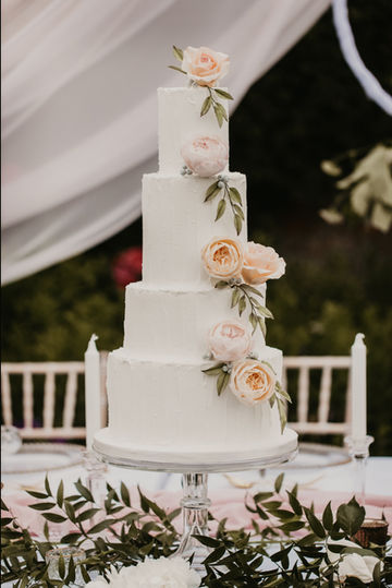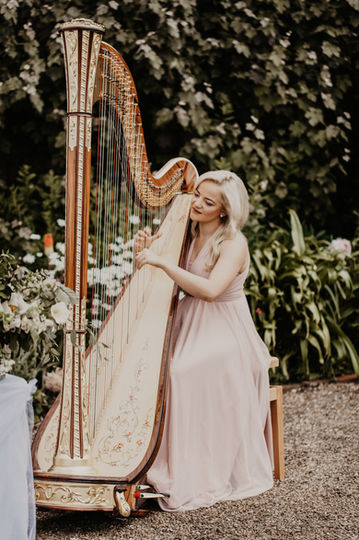 The Wedding Breakfast - EJ's vision was an Al Fresco experience with a double depth top table, using the front section to display the desserts with the cake as the centrepiece. The table was draped in soft fabrics of pink and peach tones, peonies and roses continued the soft colour palette and greenery meandered through the details bringing everything together. Finally adding the finishing touch is beautiful harpist, Soraya Vermuelen.